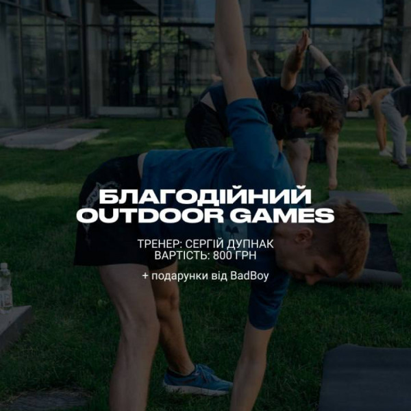 Charity Games Workout - Date: September 21 - Time: 10 a.m. - Location: Duck’s Lake - Coach: Serhii Dupnak - Price: 800 UAH Get ready for action, energy, and gifts from our friends at BAD BOY As always, all funds will be donated to the Come Back Alive foundation Smart people train with purpose!